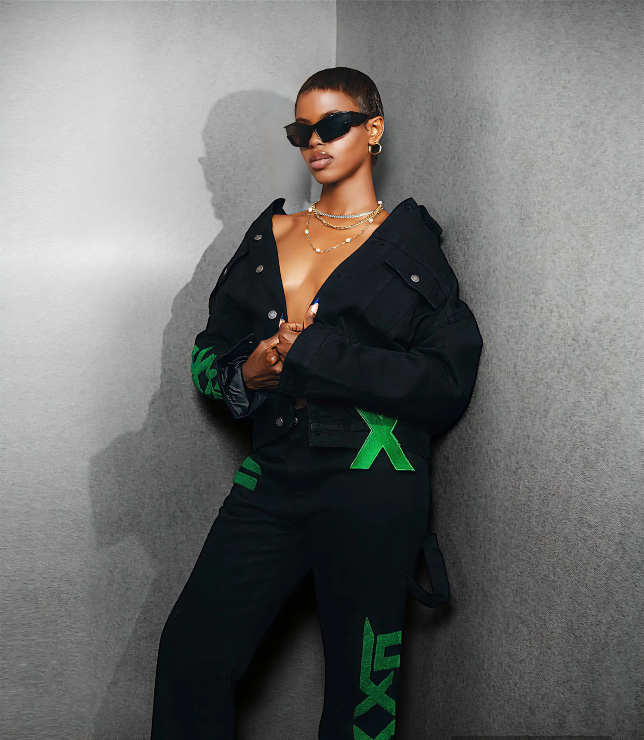 NXXN Denim Pants: A Green Chenille Delight Step into bold elegance with the NXXN Denim Pants, adorned with the iconic NXXN Chenille Logo in vibrant green embroidery on the side. Showcasing two back pockets carrying a Green X EMBROIDERY, a front button, and a stylish green leather patch, these pants are crafted from 100% black cotton. The comfortable fit ensures ease of movement, making them a versatile choice for various occasions. Note: Hand wash only to preserve the vibrant colors and quality.